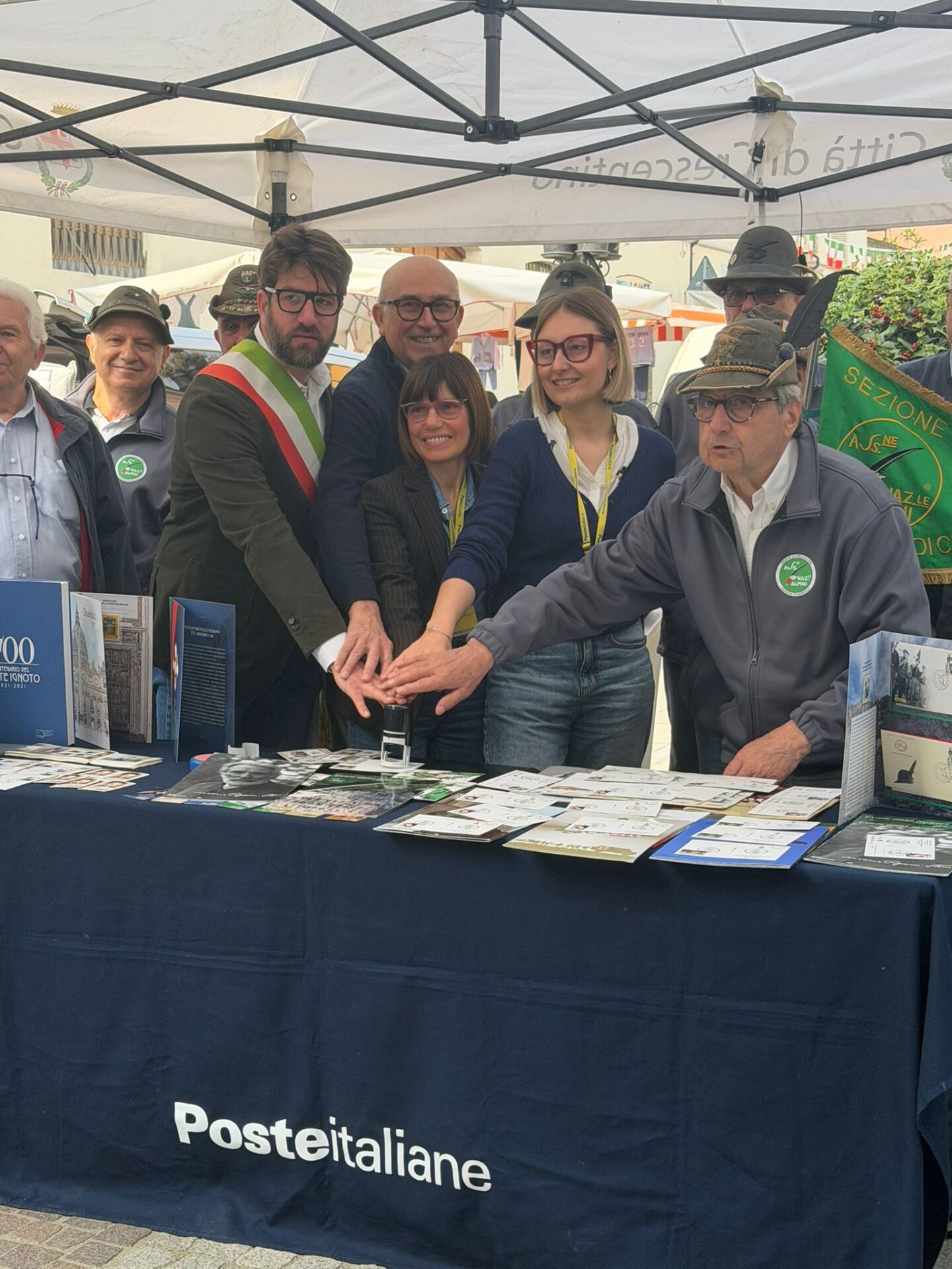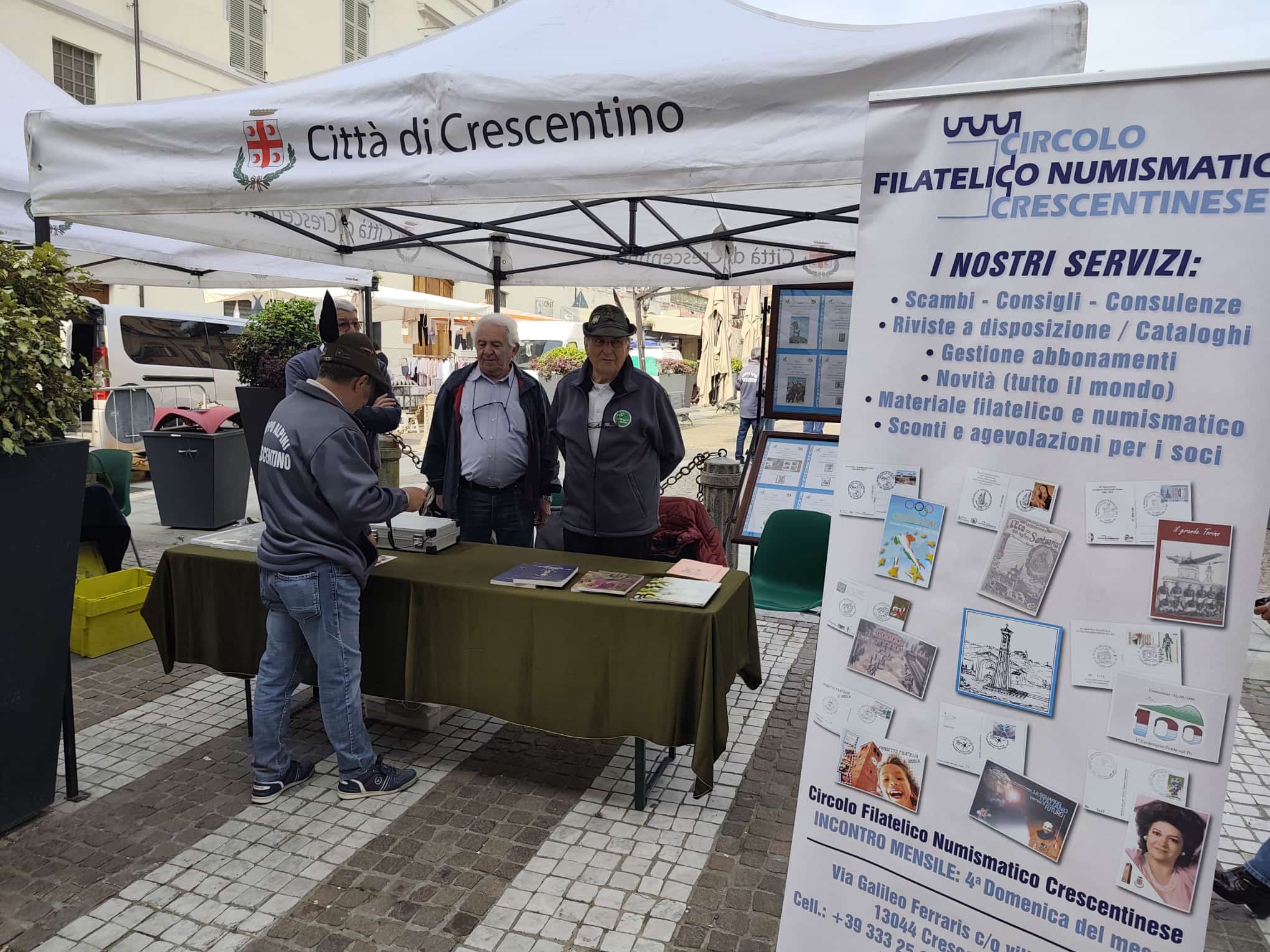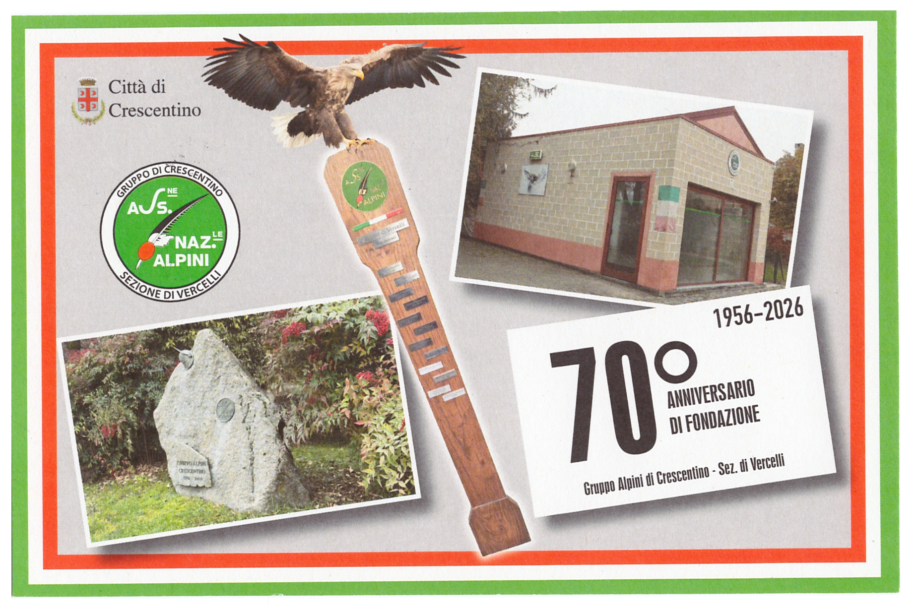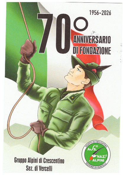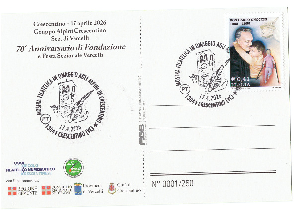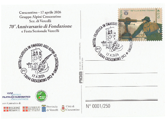 Nell’ambito della manifestazione per celebrare i 70 anni della fondazione del Gruppo Alpini di Crescentino il Circolo Filatelico Numismatico Crescentinese ha preparato un annullo filatelico dedicato su due cartoline realizzate per l’occasione. Il bozzetto utilizzato per annullare le cartoline è stato preparato dalla sig.ra Laura Arena ed è stato attivato nella giornata di venerdì 17 aprile 2026 un ufficio postale distaccato con l’intervento del personale dell’ufficio centrale delle Poste Italiane di Vercelli.